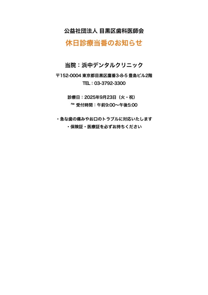 9月23日祝日は公益社団法人目黒区歯科医師会の休日当番の担当医です。