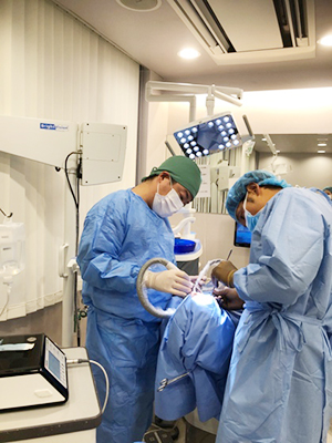 治療計画に沿ってインプラント専門医が静脈内鎮静法下でインプラントの埋入手術を行います。