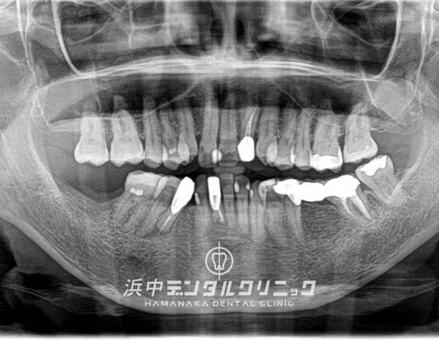 上顎は虫歯と歯周病で残念ながら全て抜歯の適応でした。患者様はまだ50代というご自身の年齢と、今後のQOL(クオリティオブライフ)を検討した結果、現在の残ってる数本の歯を抜歯して即時手術で固定の人工歯が入ってその日からお食事可能なインプラント治療のオールオン4治療を選択されました。また下顎はご自身の歯を全て残す治療が選択可能でした。
