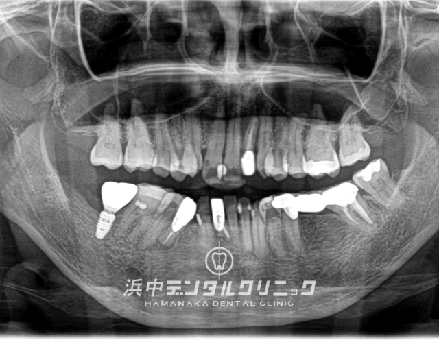 左下の3本欠損部の骨内には2本のインプラント(フィクスチャー)を埋入して、上部構造(被せ物)は3本のインプラントセラミックブリッジとしてました。