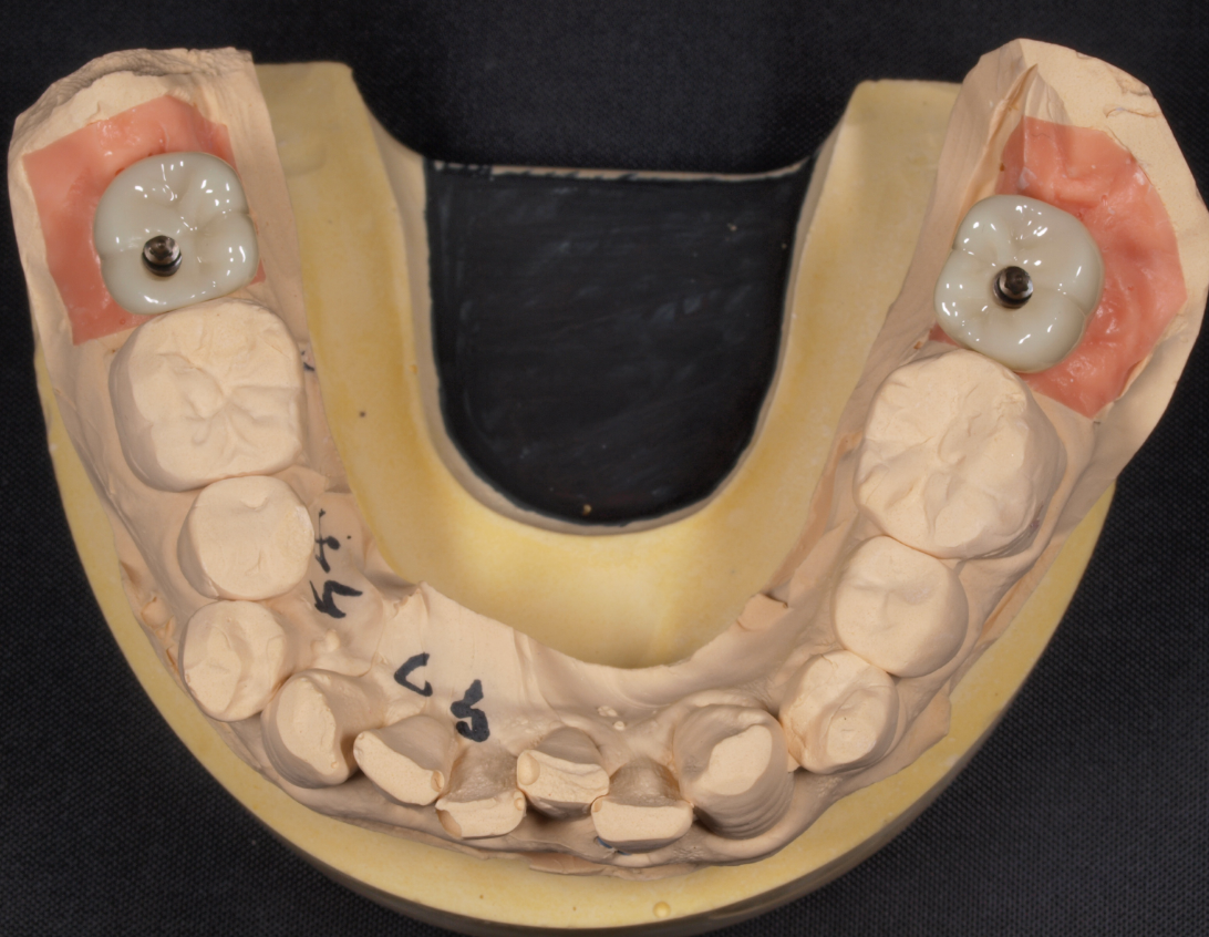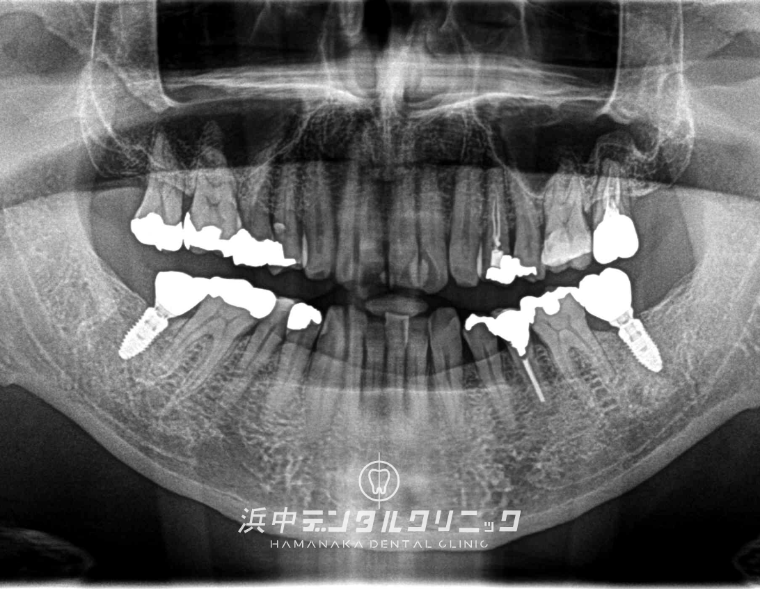 下顎左右両側の7番目の歯を抜歯後にインプラントを埋入して仮歯を経て最終上部構造(ジルコニアセラミック)をスクリュー固定しました。
